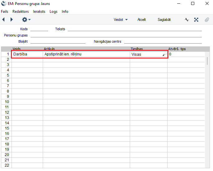 Lai mainītu tiesības, dodieties uz Sistēmas moduli > Iestatījumi > Personu grupas. Atrodiet grupu, kurai pieder lietotājs, un atveret to. Brīvajā rindā pievienojiet: “Darbība / Apstiprināt ienākošo rēķinu / Visas”