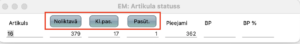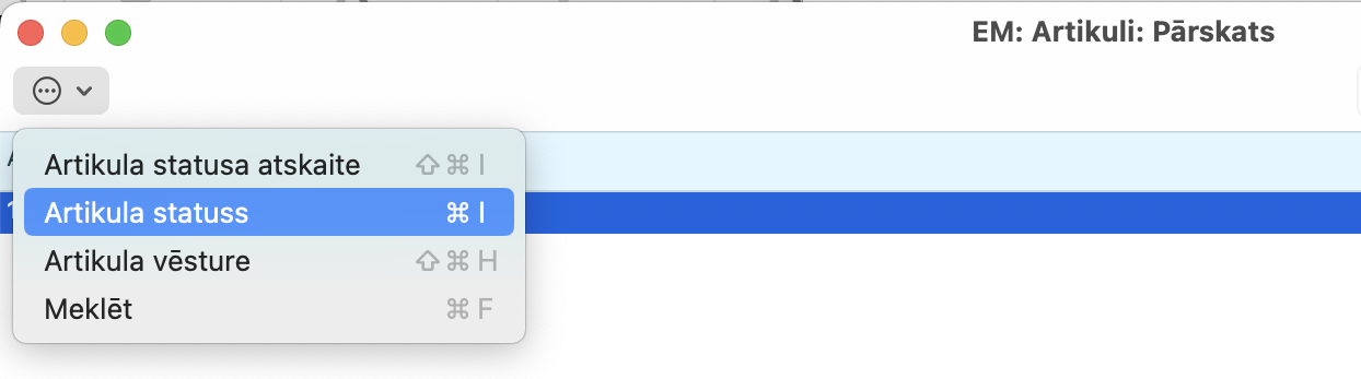 No jebkura moduļa, kurā atrodams reģistrs Artikuli, to atverot ir redzams saraksts ar artikuliem vai artikulu pārskats. Aktivizējot vajadzīgo artikulu > Darbību izvēlne (“zobrats”) > Artikula statuss.