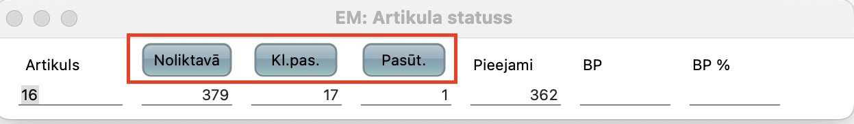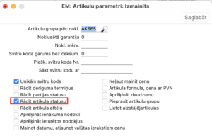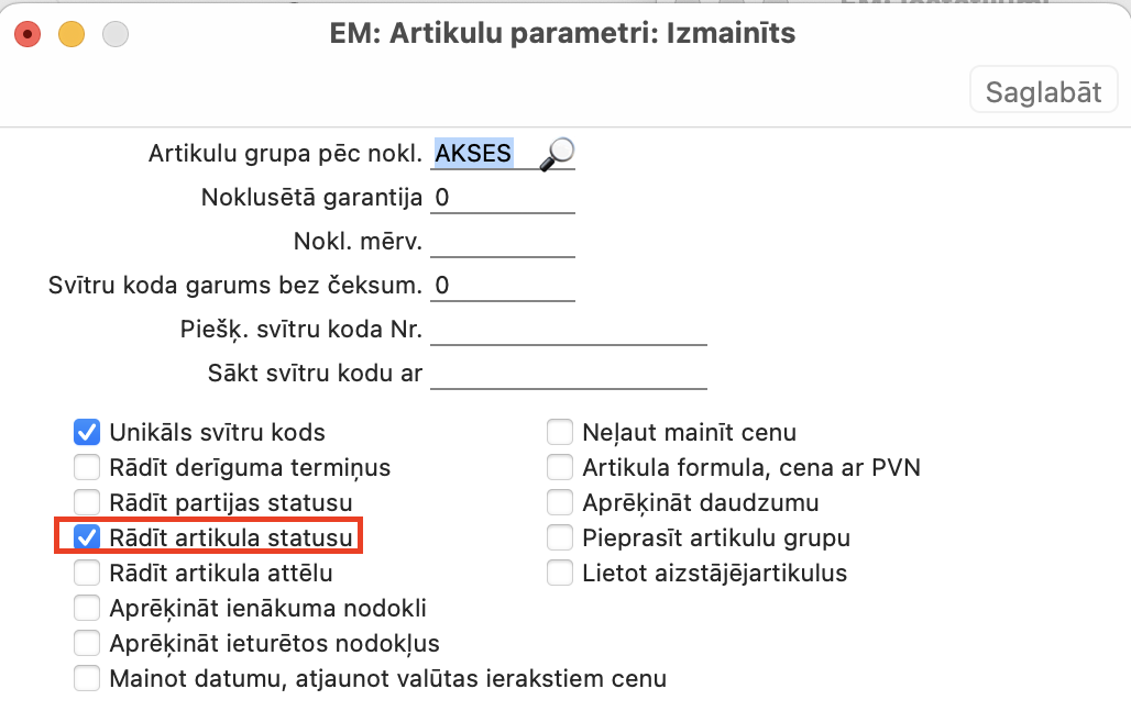 NB! Šie iestatījumi ir globāli, un Artikula statusa atskaite darbosies vienādi visiem lietotājiem, strādājot ar artikuliem saistītajos reģistros. Ja vēlaties, lai izmaiņas būtu redzamas tikai konkrētam lietotājam, tad modulī Lokālie iestatījumi > Reģistri > Artikula statusa parametri > Veidot – Jauns varat iestatīt konkrētam lietotājam redzamo informāciju.