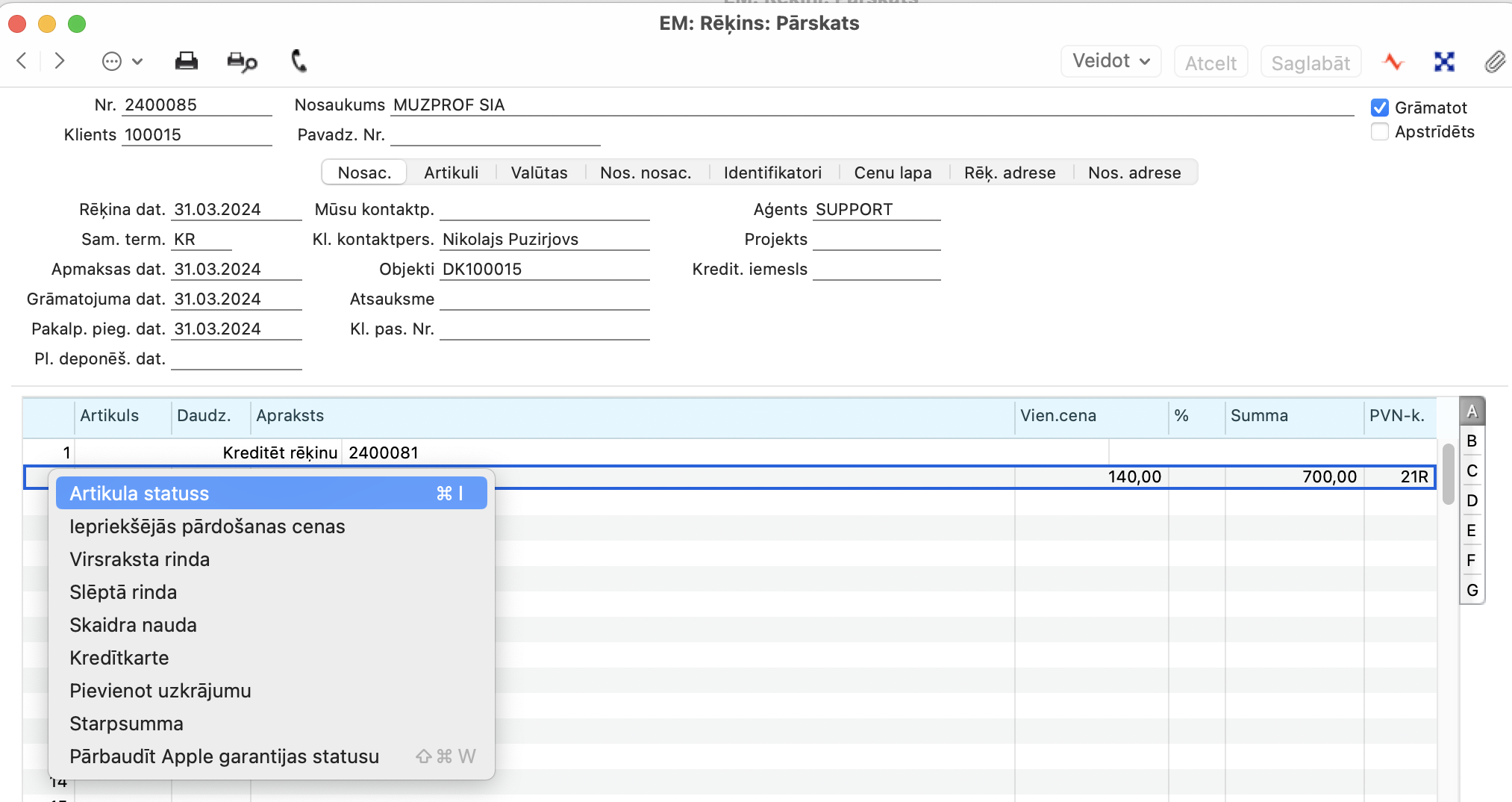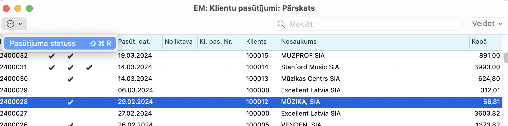 Artikula statusa pārskatu var atvērt arī no ierakstiem, kas satur artikula ierakstus. Piem. Pārdošanas vadība > Reģistri > Klienta pasūtījums vai Realizācija > Reģistri > Rēķini. Ierakstos to var atvērt no rindas izvēlnes. Lai to izdarītu, atlasiet rindu un nospiediet peles labo pogu: atlasiet opciju artikula statuss. Vai izmantojiet īsinājumtaustiņu Cmd+I.
