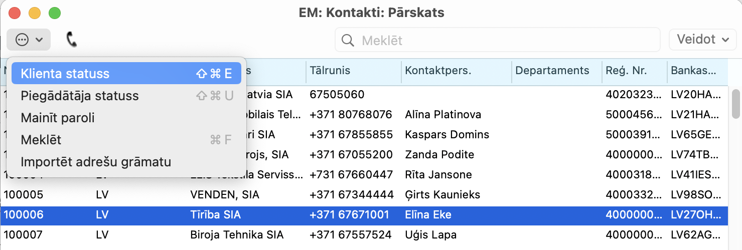 Pārskatu var atvērt no daudziem programmas logiem. Piemēram, no jebkura moduļa, kurā atrodams reģistrs Kontakti. Aktivizējot vajadzīgo kontaktu > Darbību izvēlne (“zobrats”) > Klienta statuss.