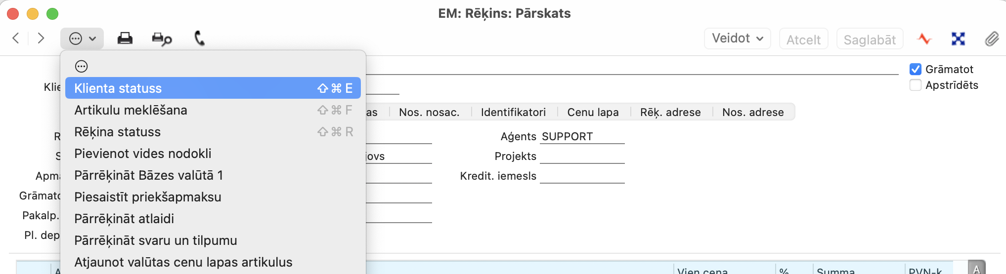 To varat atvērt arī modulī Realizācija > Reģistri > Rēķini > Rēķina ierakstā izvēloties Klienta statuss.