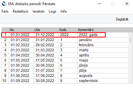 Veidojot atskaites ir iespējams atlasīt lauku “Periods” ar Ctrl-Enter, kur var redzēt šeit ievadītos periodus. Ja vēlaties izveidot atskaites par mēnesi, tad ievadiet atbilstošo periodu katram mēnesim šajā iestatījumā.