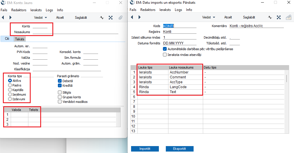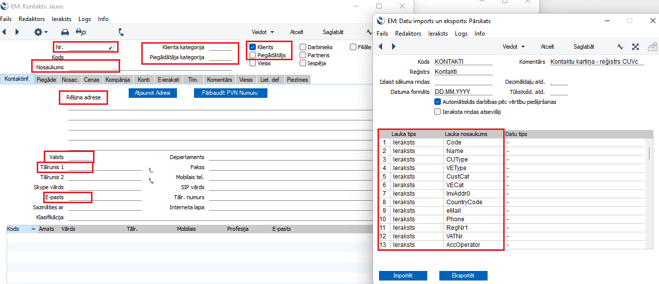 Lauku nosaukumi datu importa logā (bildē pa labi) redzamajā tabulā atbilst šādiem laukiem konta kartītē (bildē pa kreisi):