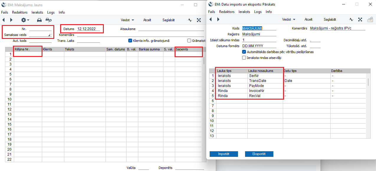 Lauku nosaukumi datu importa logā (bildē pa labi) redzamajā tabulā atbilst šādiem laukiem ienākošā rēkina kartītē (bildē pa kreisi):
