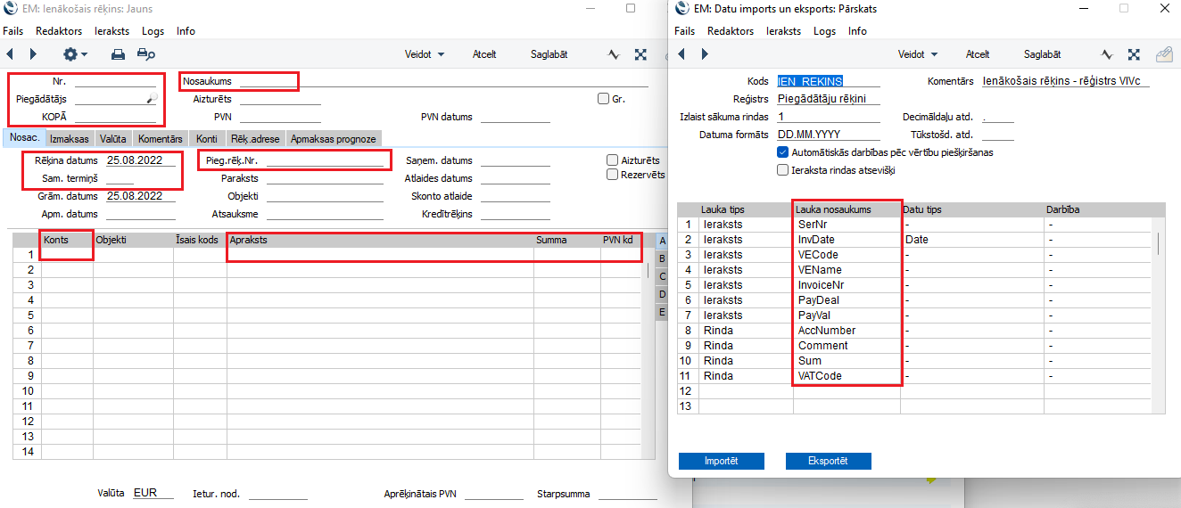 Lauku nosaukumi datu importa logā (bildē pa labi) redzamajā tabulā atbilst šādiem laukiem ienākošā rēķina kartītē (bildē pa kreisi):