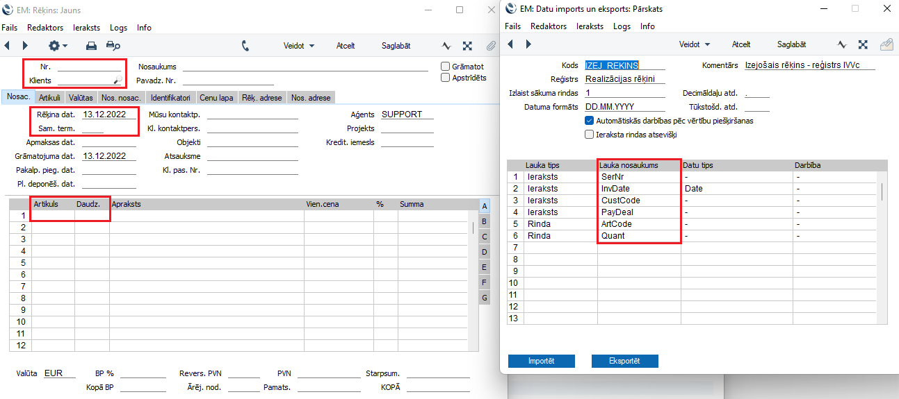 Lauku nosaukumi datu importa logā (bildē pa labi) redzamajā tabulā atbilst šādiem laukiem izejošā rēķina kartītē (bildē pa kreisi):