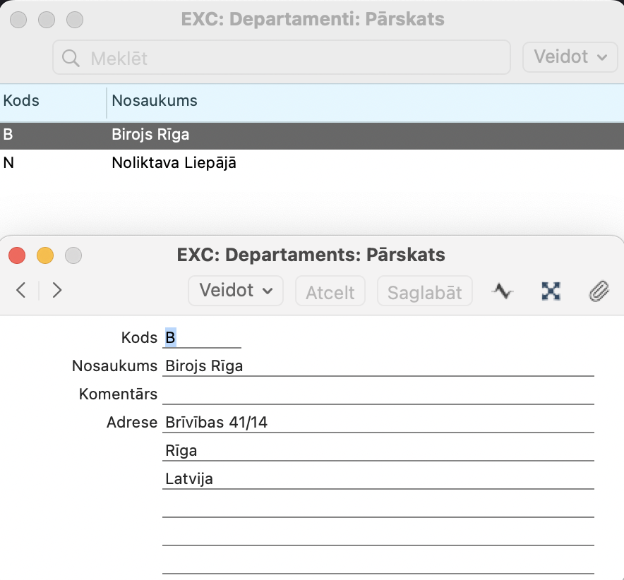 Lai izveidotu departamentu, Pamatlīdzekļu modulī aiziet uz Iestatījumiem un divreiz noklikšķiniet uz Departamenti. Tiks atvērts logs ‘Departamenti: Pārskats’ ar esošo departamentu sarakstu. Izvēlne Veidot noklikšķiniet uz Jaunu ierakstu – Departamenti vai izmantojiet taustiņu kombināciju Ctrl-N (Windows un Linux) vai ⌘-N (Mac). Varat arī izvēlēties līdzīgu departamentu tam, kādu vēlaties ievadīt, un Izvēlne Veidot noklikšķināt uz Ieraksta kopiju.