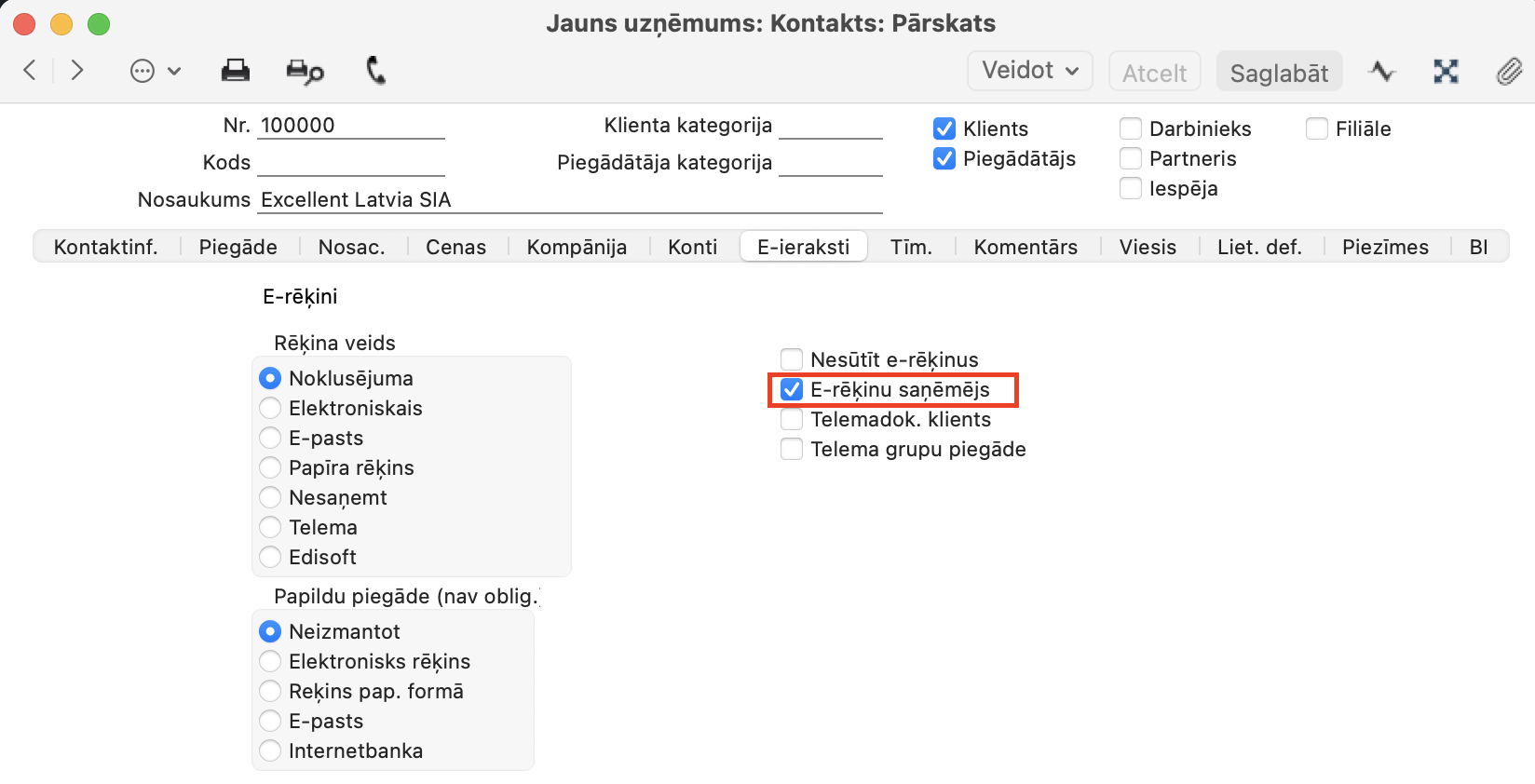 Specifikācijas logā ir iespējams atzīmēt vēlamo rēķinu nosūtīšanas veidu katram kontaktam atsevišķi zem Rēķina veids un Papildu piegāde.