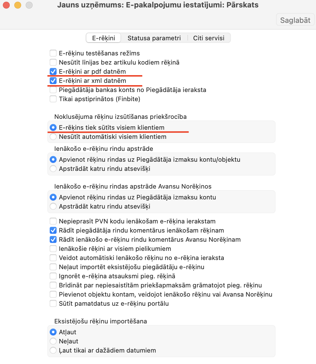 - atzīmējiet “E-rēķini ar pdf datnēm”, ja vēlaties e-rēķina PDF fails tiktu automātiski iekļauts rēķinā