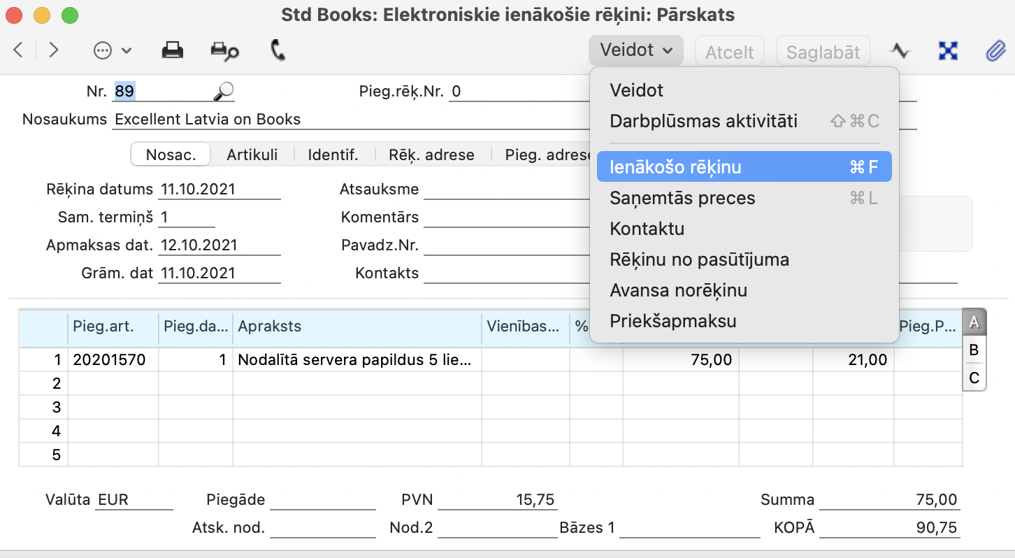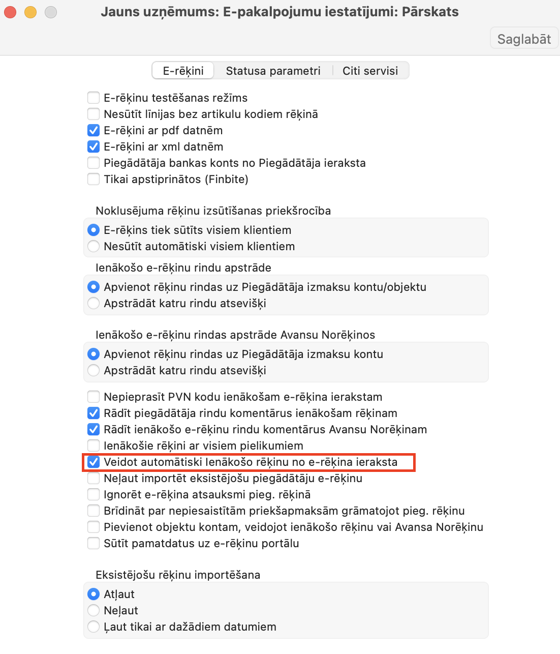 NB! Ir iespēja iestatīt, lai Ienākošais rēķins veidotos automātiski no e-rēķina, atzīmējot Modulī Sistēma > Iestatījumi > E-pakalpojumu iestatījumi > sadaļā E-rēķini > Veidot automātiski Ienākošo rēķinu no e-rēķina ieraksta.