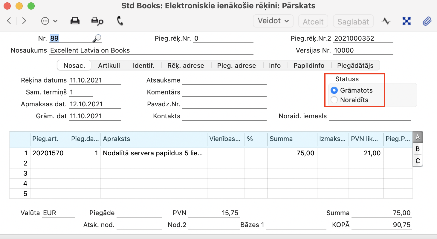 Ja ir veikta sākotnējā sistēmas konfigurācija un programmai ir derīga atslēga, visi rēķini tiks automātiski saņemti modulī Piegādātāji > Reģistri > Ienākošo e-rēķini. Pārbaudot saņemto rēķinu, atliek tikai mainīt tam statusu uz “Grāmatot” un izveidot Ienākošo rēķinu (Piegādātāji > Reģistri > Ienākošo rēķini).