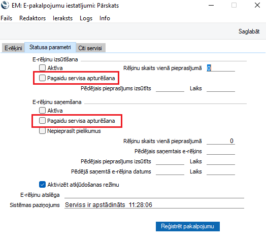 Sadaļā “Statusa parametri” nedrīkst būt ķeksīša pie izvēles “Pagaidu servisa apturēšana”.