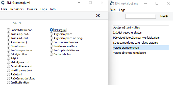 2. Dodieties uz moduli Sistēma > Rutīnas > Apkalpošana > Veidot grāmatojumus. Atzīmējiet no saraksta “Maksājumi” un Laukā “Sērijas numurs” ievadiet maksājuma numuru.