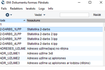 1. Modulī Sistēma > Reģistri > Dokumentu formas > atrodiet formu, ko vēlaties labot.
