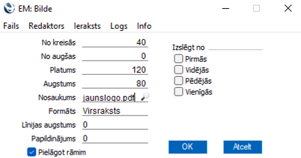 Ar dubultklikšķi var atvērt uzzīmēto taisnstūri, kas atvērs logu “Bilde” kā attēlā augstāk. Sekojiet instrukcijā 3.punkta sākumā un atzīmējiet “Pielāgot rāmim”.