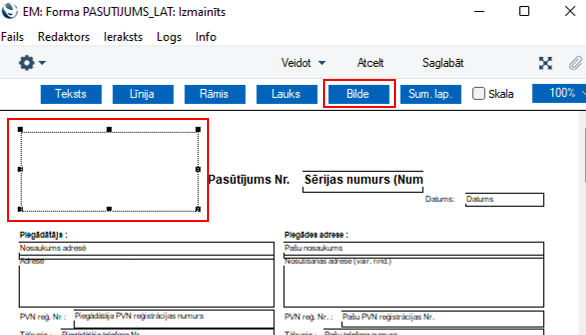 Ja izvēlētajā formā nav lauka “Bilde”, tad to var pievienot nospiežot pogu “Bilde”, ieklikšķinot vēlamajā vietā un ar kursoru velko taisnstūra formu vajadzīgajā lielumā