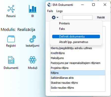Lai pievienotu eksistējošu dokumentu formu dokumentam, tad attiecīgajā modulī ejiet uz Dokumenti > izvēlaties attiecīgo dokumentu, ko vēlaties drukāt > iezīmējiet to > no darbību izvēlnes > Definēt dokumentu.