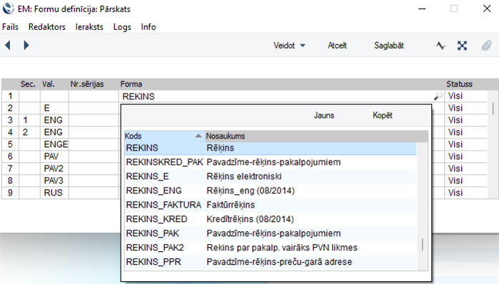 1. Atrodiet dokumenta veidni modulī Sistēma > Reģistri > Dokumentu formas, kuru vēlaties mainīt.