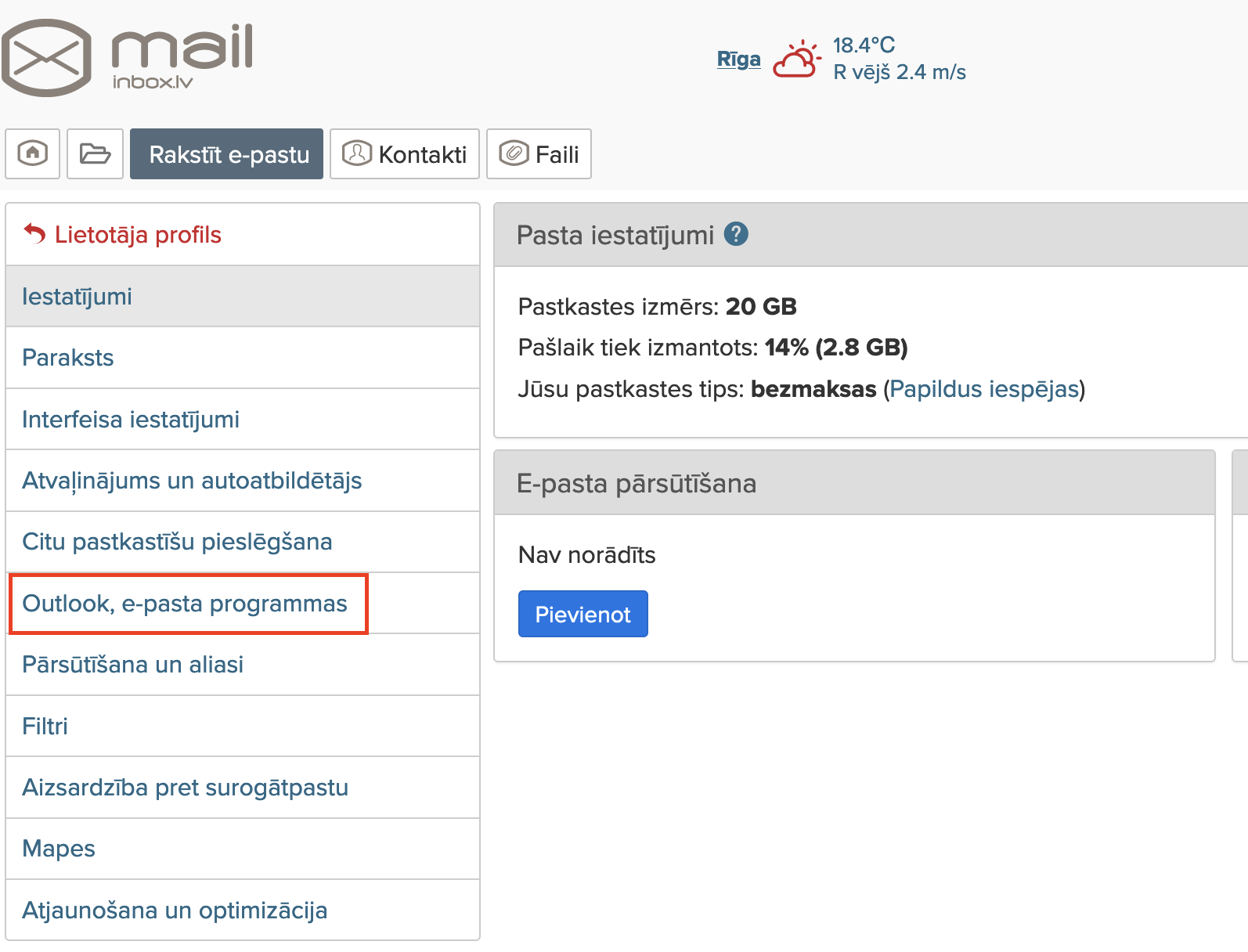 4. Modulis E-pasts un konferences > Iestatījumi > Pastkastes pārlūks. Personas pastkastes ieraksta sadaļā “Identifikators” ir jābūt aizpildītam laukam “Ār. e-pasta adr.”.