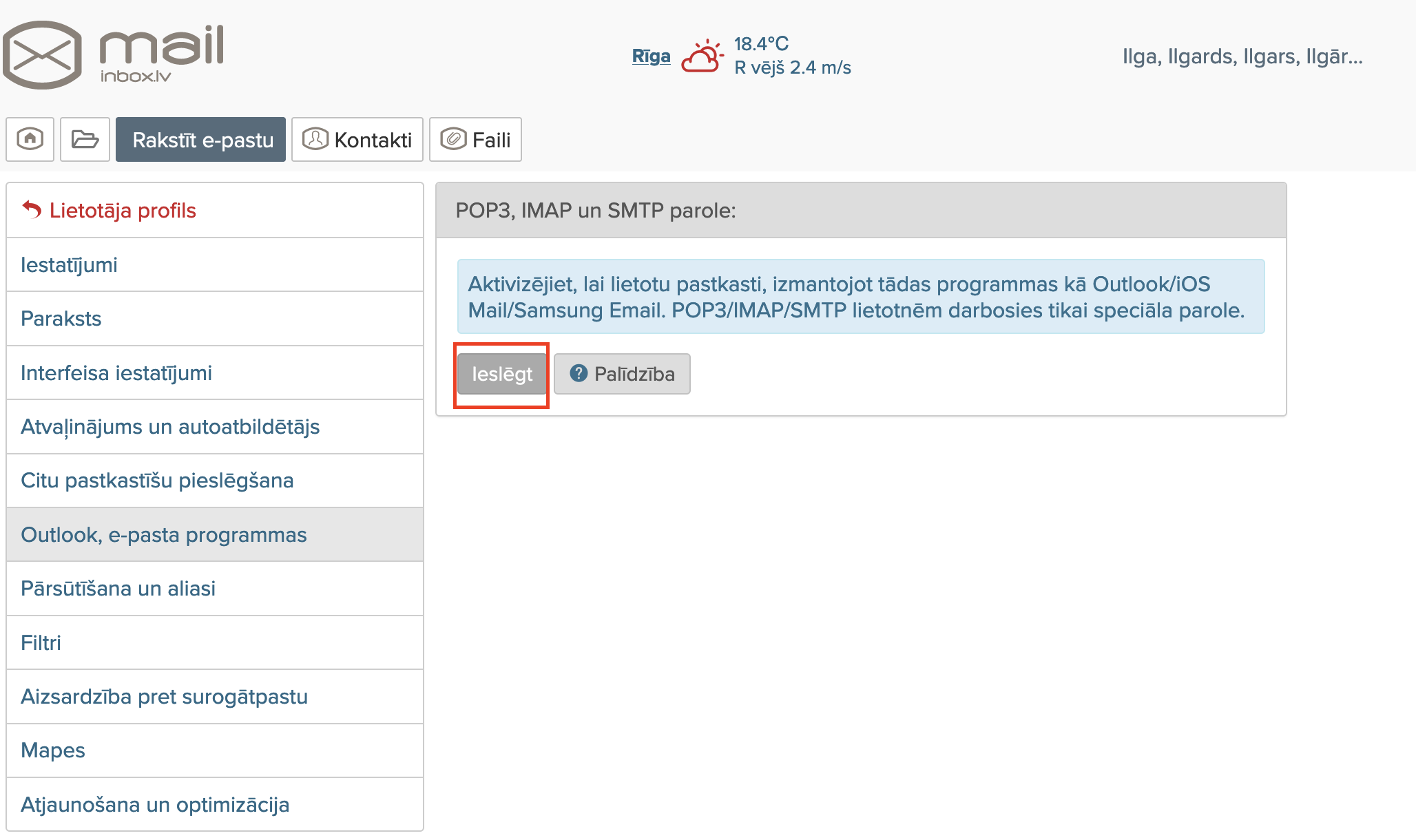 Menu >E-pasta iestatījumi > Outlook, e-pasta programmas > Ieslēgt > SMTP parole