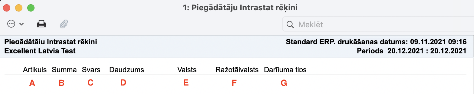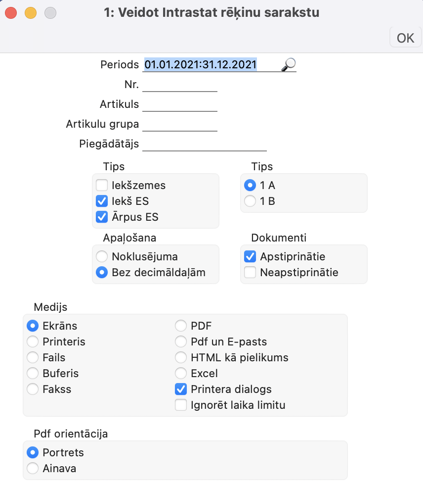Modulis Piegādātāji > Atskaites > Piegādātāju Intrastat rēķini