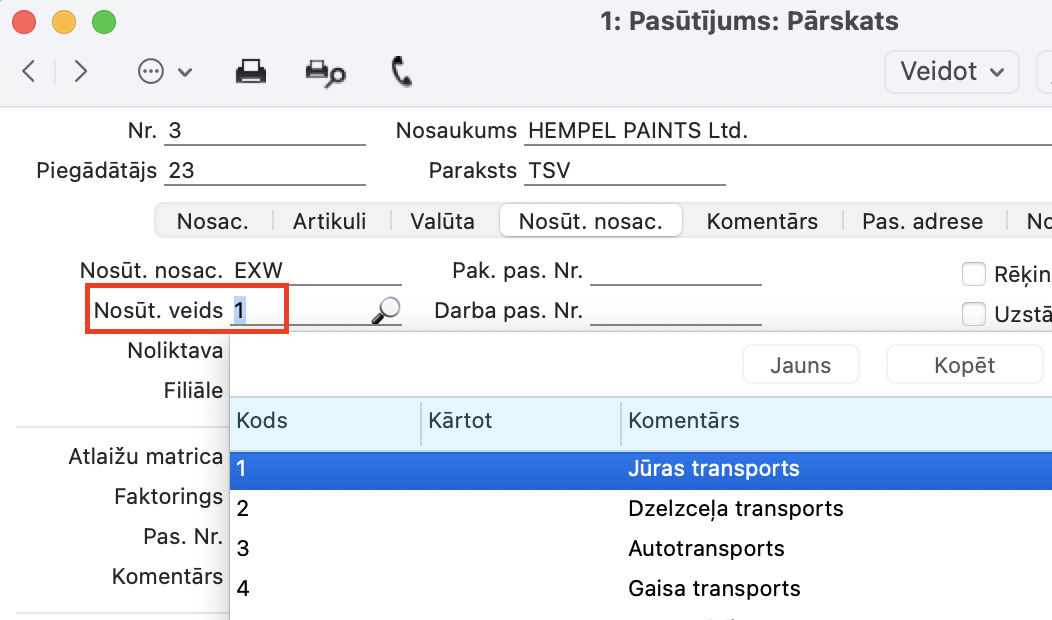 Loģistika > Pasūtījumu reģistrs > Pasūtījumi > sadaļā Nosūt. Nosac.> Lauks “Nosūtīšanas Veids”