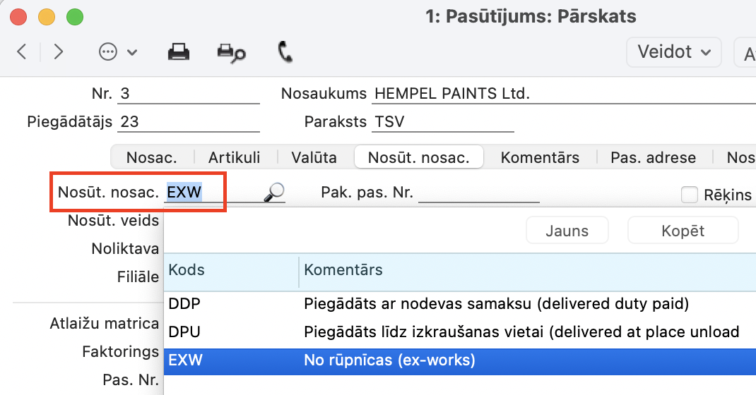 Loģistika > Pasūtījumu reģistrs > Pasūtījumi > sadaļā Nosūt. Nosac. > Lauks “Nosūtīšanas Nosacījumi”