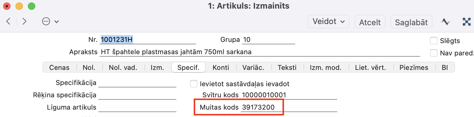 Realizācija > Artikulu reģistrs > Artikuls > sadaļā Specifikācija > Muitas kods, ja Muitas kods ir tukšs, tad tiek izmantots artikula Nr.