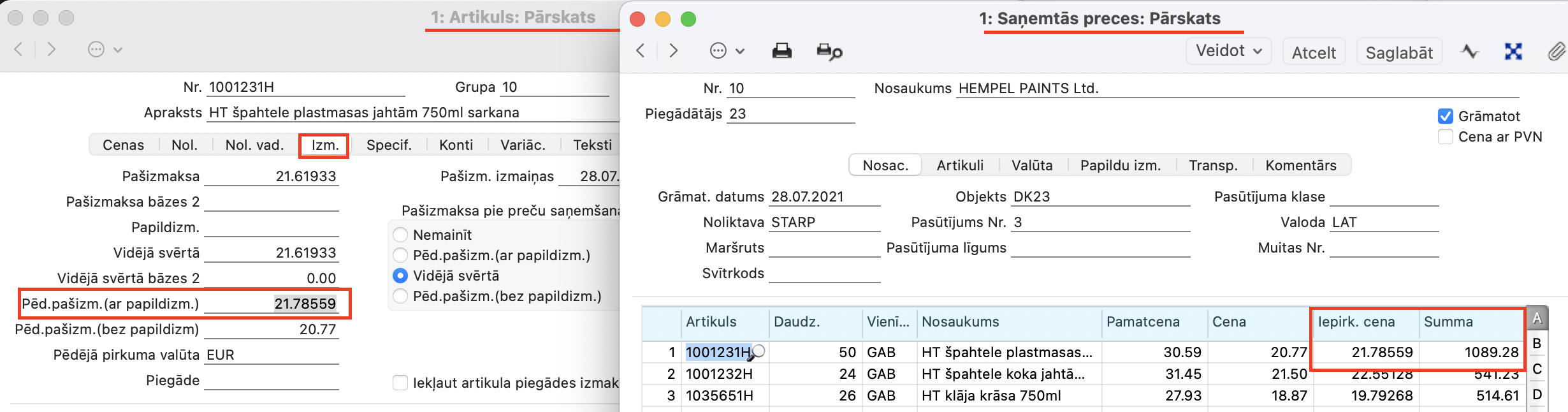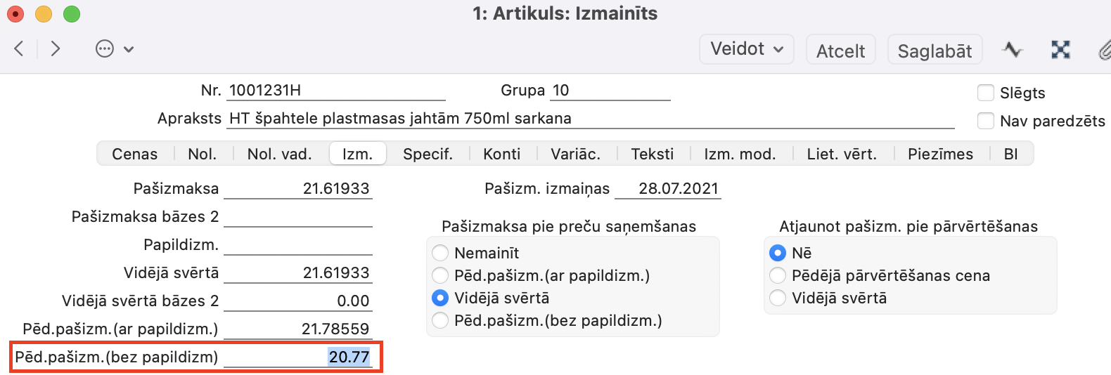 Realizācija >Artikulu reģistrs > Artikuls > sadaļā Izmaksas > Pēdēja Pašizmaksa