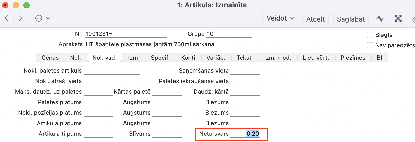 Realizācija > Artikulu reģistrs > Artikuls > sadaļā Noliktavas Vadība > Neto svars