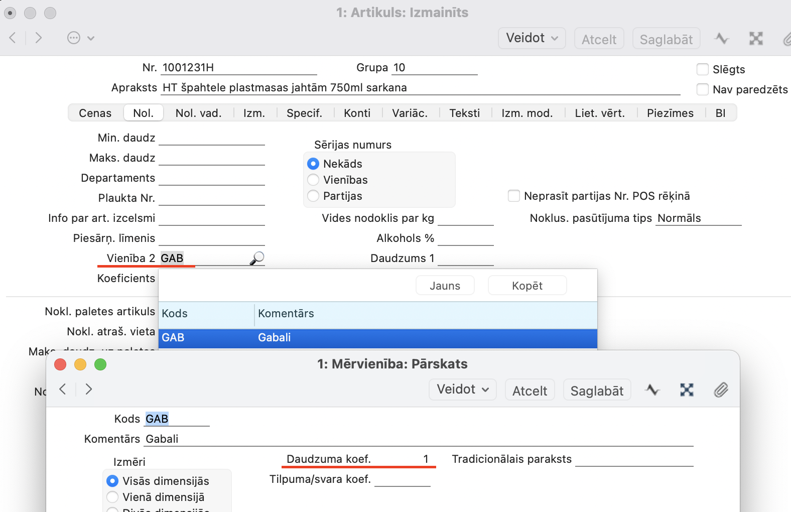 Realizācija > Artikulu reģistrs > Artikuls > sadaļā Noliktava > Vienība 2 (jānorāda vienību un vienības uzstādījumos – daudzuma koeficientu)