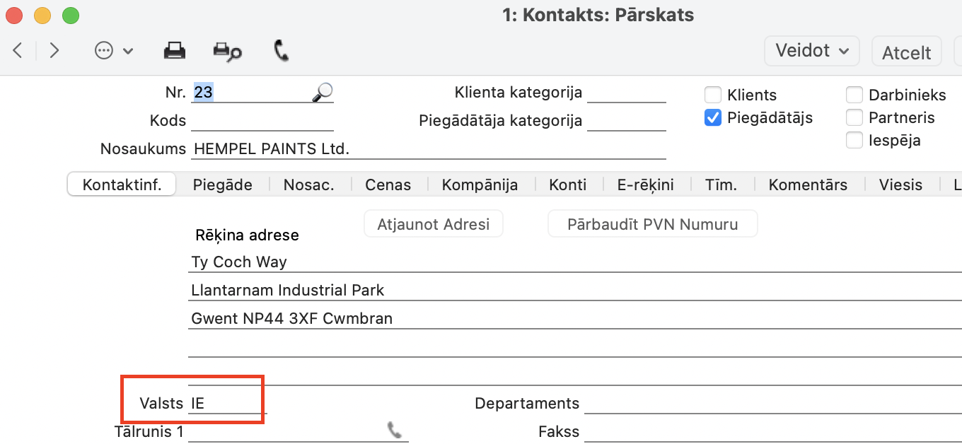 Realizācija > Kontaktu reģistrs (Piegādātāja kartīte) > sadaļā Kontaktinformācija > Valsts