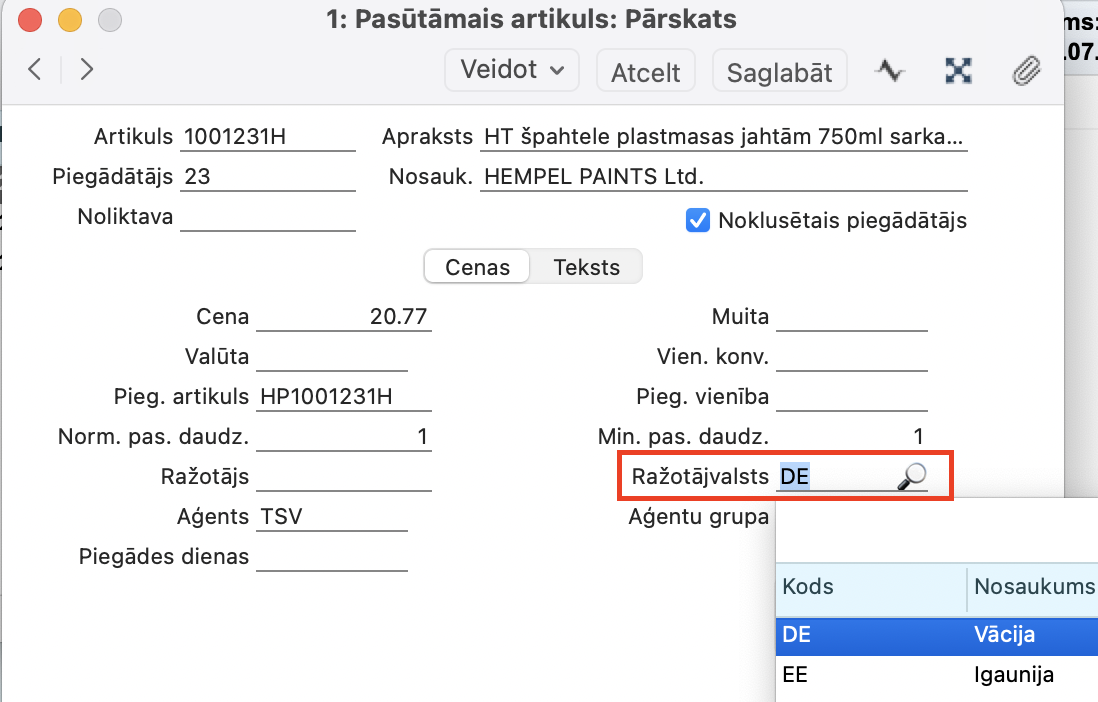 Loģistika > Pasūtījumu artikulu reģistrs > jāizveido pasūtījuma artikulu, jānorāda Piegādātājs un Ražotājvalsts