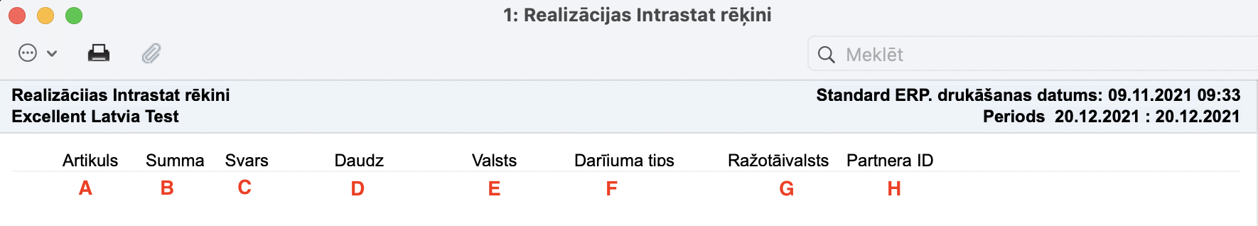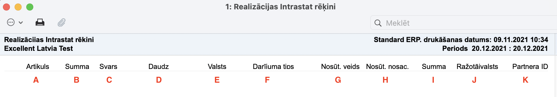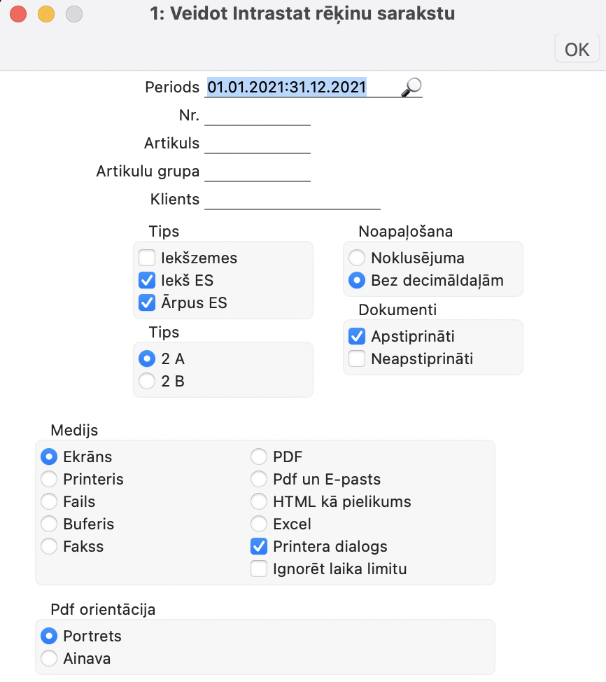 Modulis Realizācija > atskaite Realizācijas Intrastat rēķini