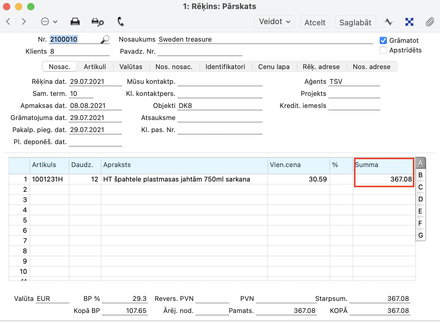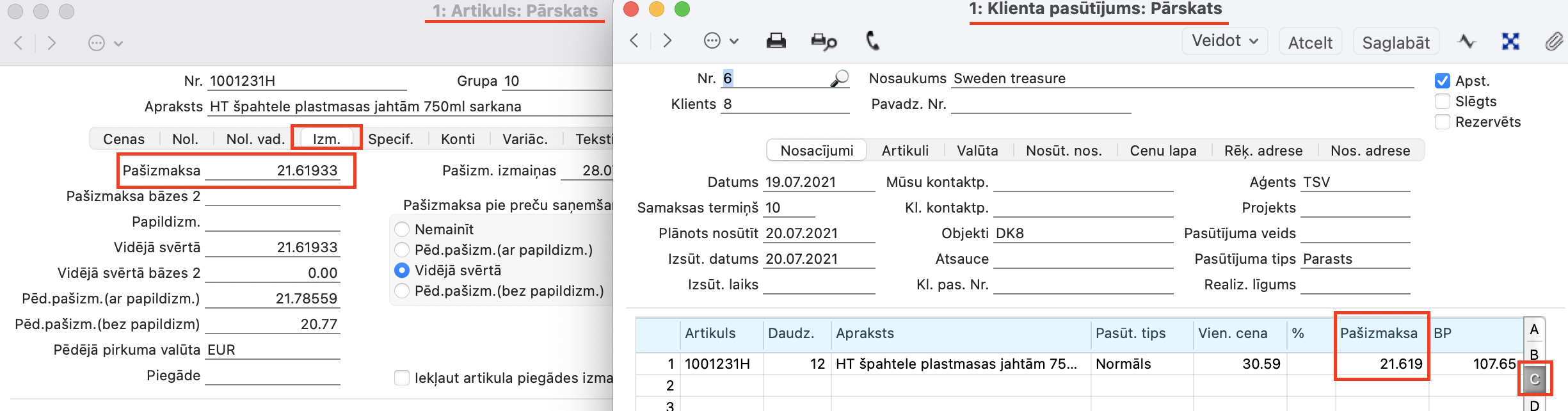 Pārdošana > Klientu pasūtījumi reģistrs > Klienta pasūtījums > nodaļā C > Pašizmaksa (tiek ņemta no Artikulu reģistrs > Artikuls > sadaļā Izmaksas > Pašizmaksa)
