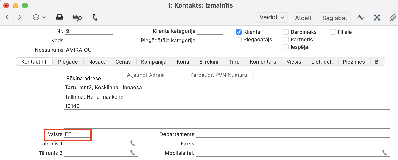 Realizācija > Kontaktu reģistrs (Klienta kartītē) > sadaļā Kontaktinformācija > Valsts
