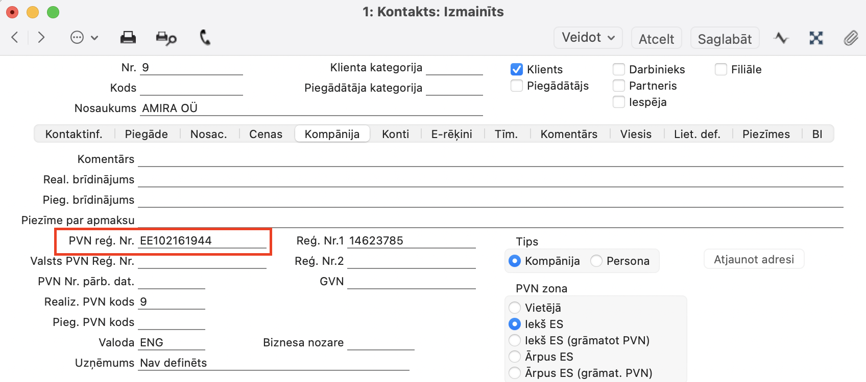 Kontaktu reģistrs (Klienta kartītē) > sadaļā Kompānija > PVN reģ.Nr.