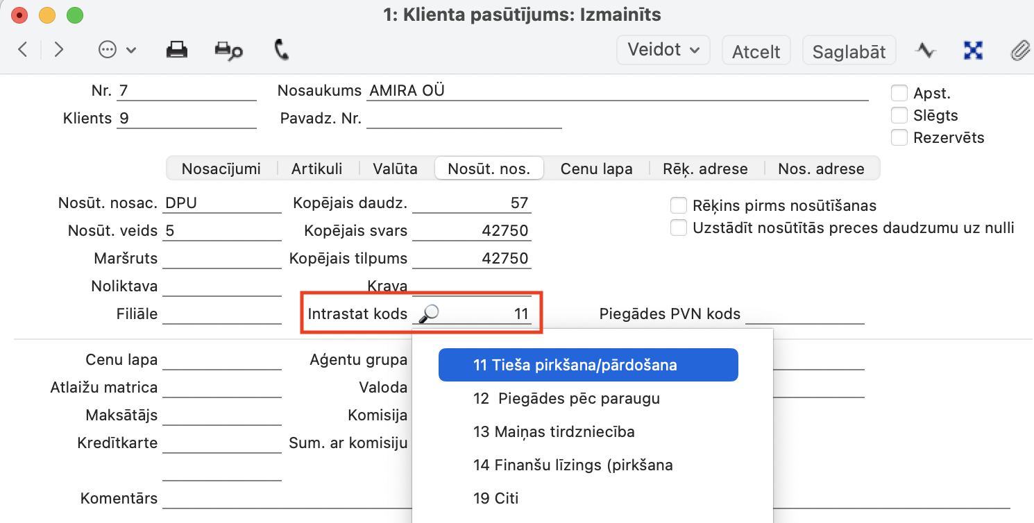 Loģistika > Pasūtījumu reģistrs > Pasūtījumi > sadaļā Nosūt. Nosac. > Lauks “Intrastat grām. kods”. Lauku vērtības var laicīgi sagatavot Realizācijas modulī > Iestatījumi > Intrastat darījuma kodi