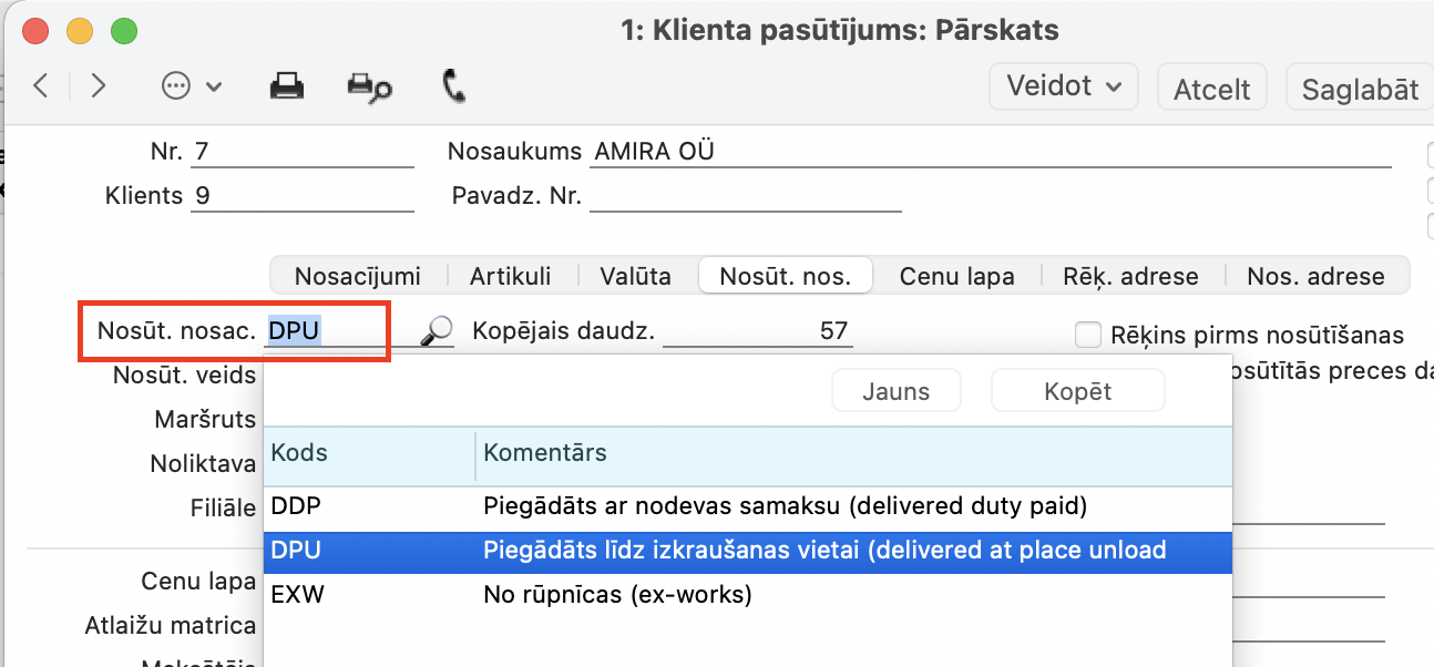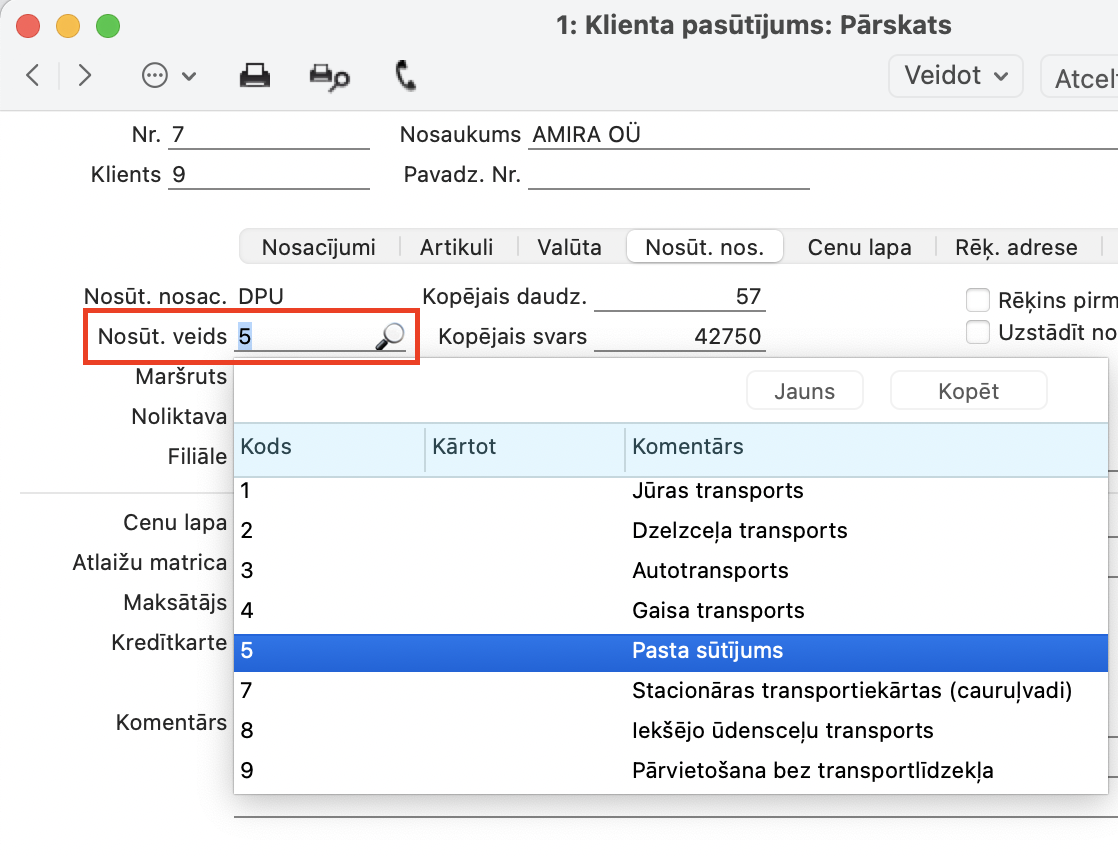Pārdošana > Klientu pasūtījumu reģistrs > Klienta pasūtījums > sadaļā Nosūtīšana Nosacījumi > Lauks “Nosūtīšanas Veids”