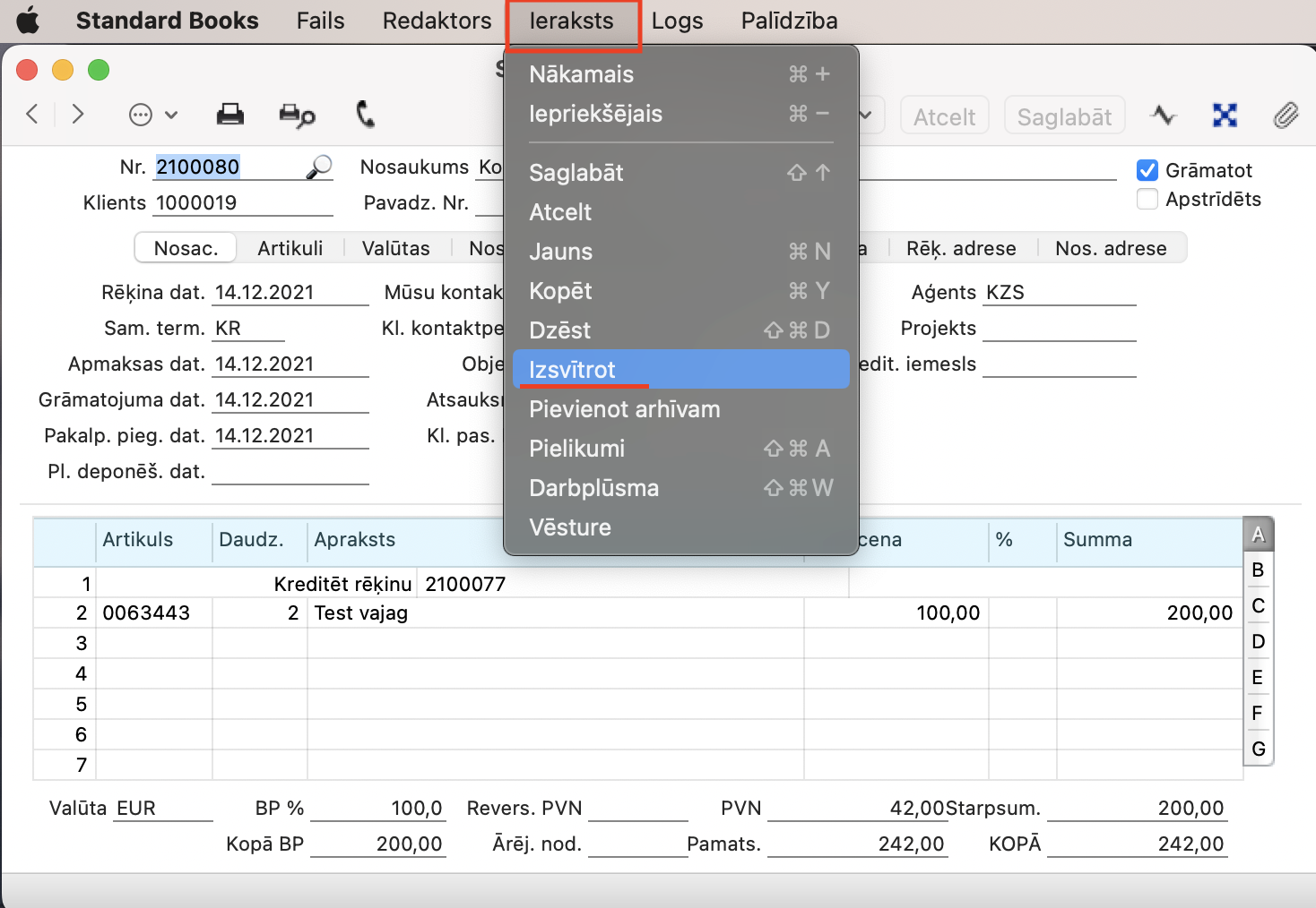 Šim nolūkam atveriet kļūdaino kredītrēķinu (nav svarīgi vai kredītrēķins tika izveidots Realizācija > Reģistri > Rēķini vai Piegādātāji > Reģistri > Ienākošie rēķini) un izvētieties Ieraksts > Izsvītrot.