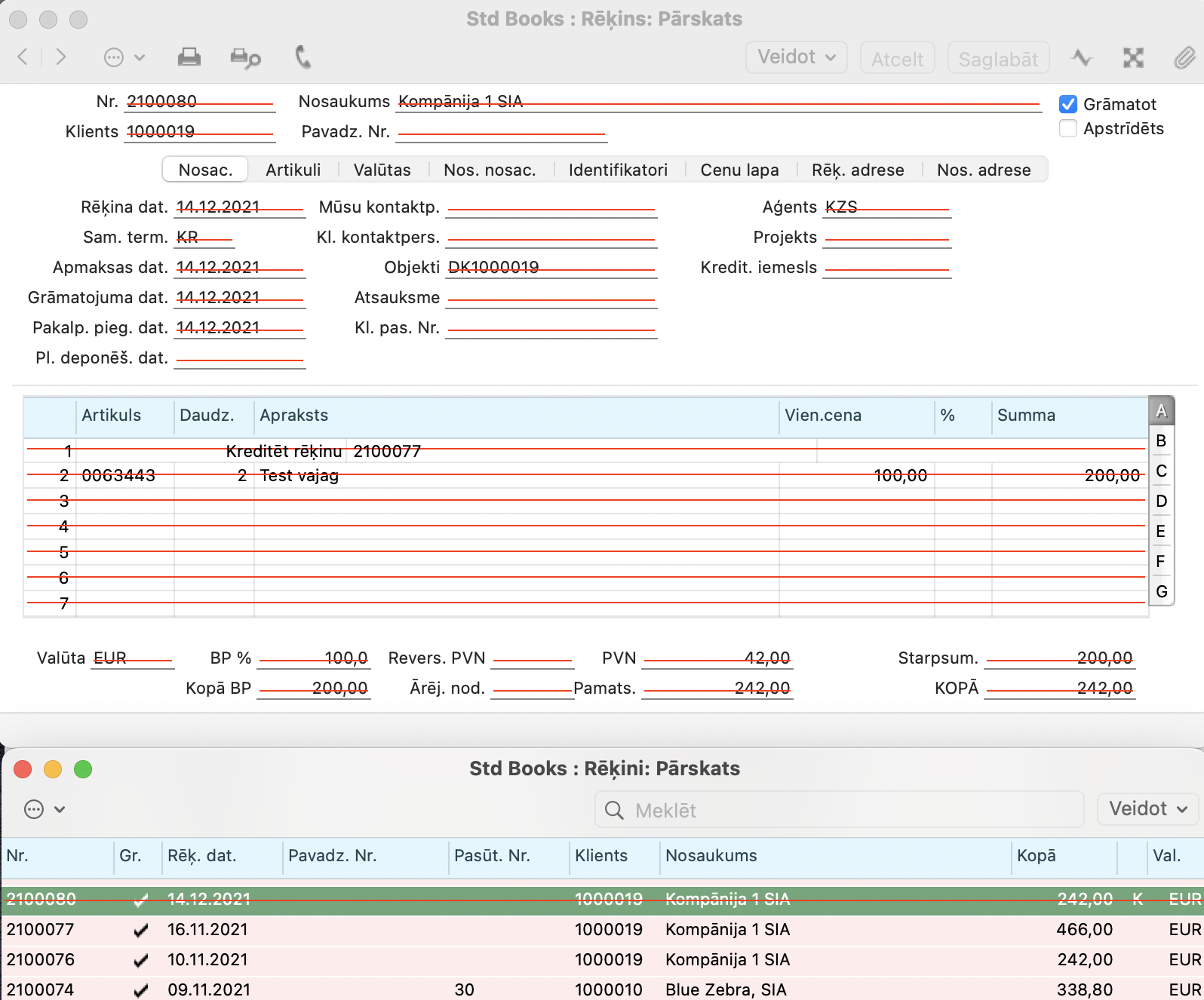 Uz atceltā rēķina parādās sarkana līnija, kā arī pašā rēķinu reģistrā ieraksts tiks atspoguļots ar sarkano līniju.