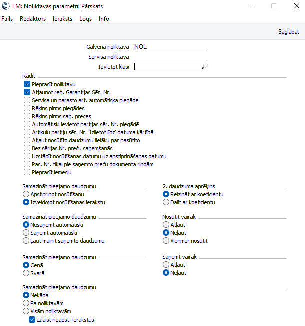 Pieprasīt noliktavu – Ja ir atzīmēta šī izvēle, tad visu noliktavas kustību (nosūtīšana, saņemšana) un Rēķinu gadījumā ir jānorāda noliktava. Ja šī izvēle nav atzīmēta un noliktavas kustību gadījumā noliktava netiek norādīta, tad automātiski tiek izmantota Galvenā noliktava.