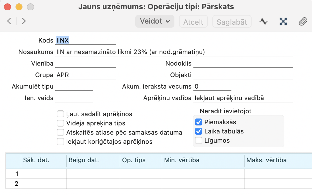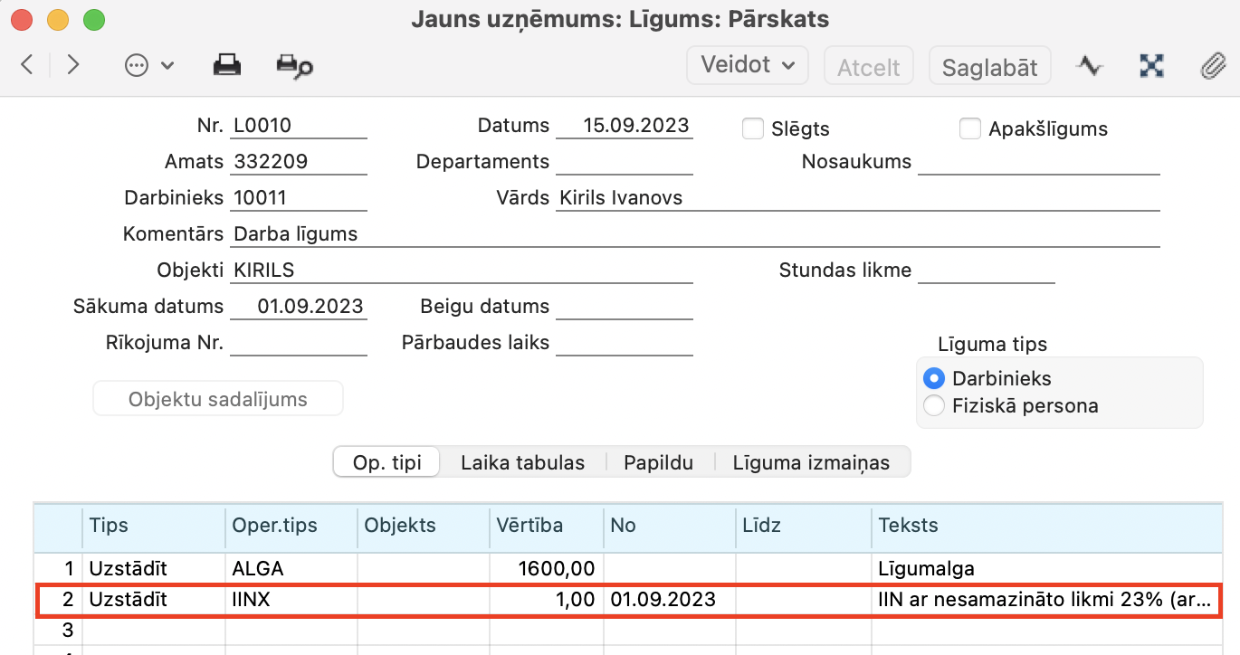2. Algas > Reģistri > Līgumi > Op.tipi > Tips “Uzstādīt”, Op.tips “IINX”, Vērtība “1” , norādiet datumu No – līdz.