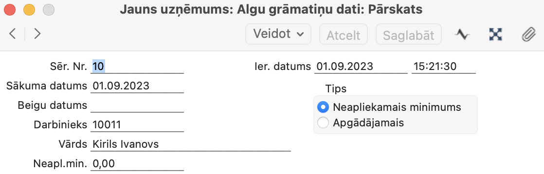 NB! Protams, šis nosacījums strādās, ja darbinieka nodokļa grāmatiņa ir reģistrēta uzņēmumā, un dati ir reģistrēti programmā Algas > Iestatījumi > Algu grāmatiņu dati.