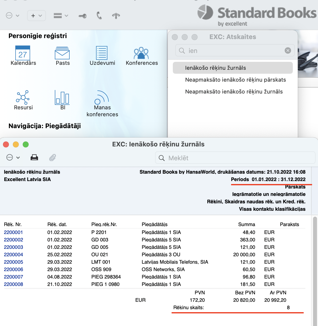 Ienākošo rēķinu skaitu vari apskatīt modulī Piegādātāji > Atskaites > Ienākošo rēķinu žurnāls.