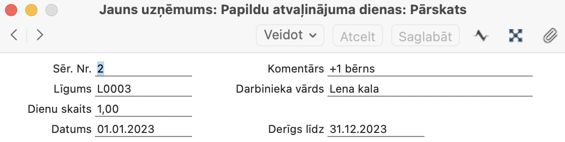 - Rādīt papildu atvaļinājumu – ja jūs zināt, ka darbiniekam bija ieraksti Algas > Iestatījumi > Papildu atvaļinājuma dienas