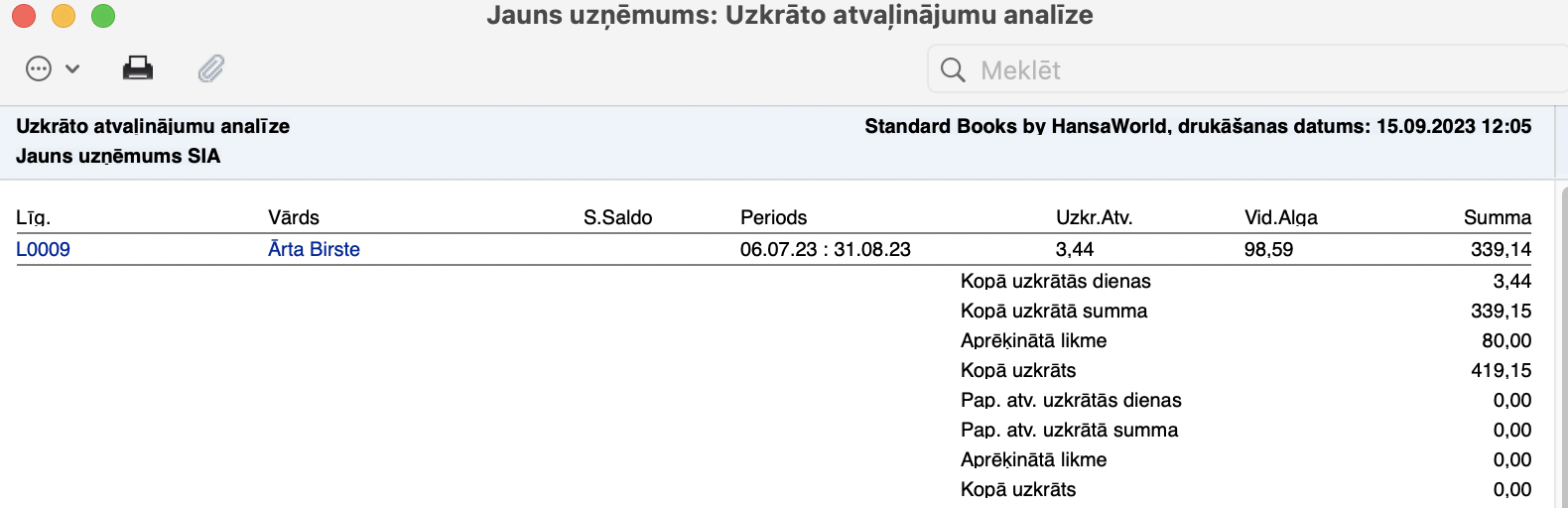 Uzkrātā atvaļinājuma summa – 339.15 EUR