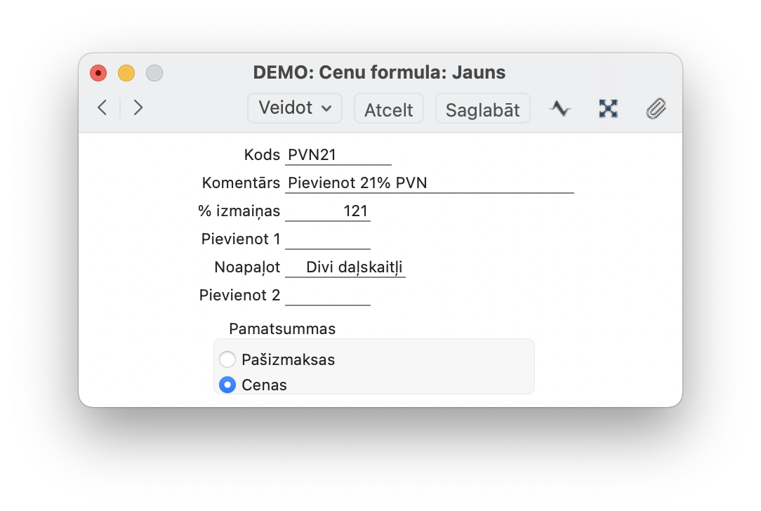 1. Izveido nepieciešamās formulas reģistrā Cenu formulas, piemēram, lai pareizinātu bāzes cenu ar 1.21.