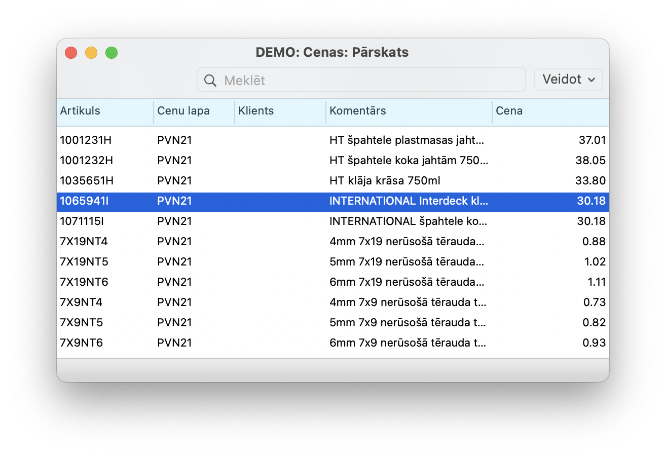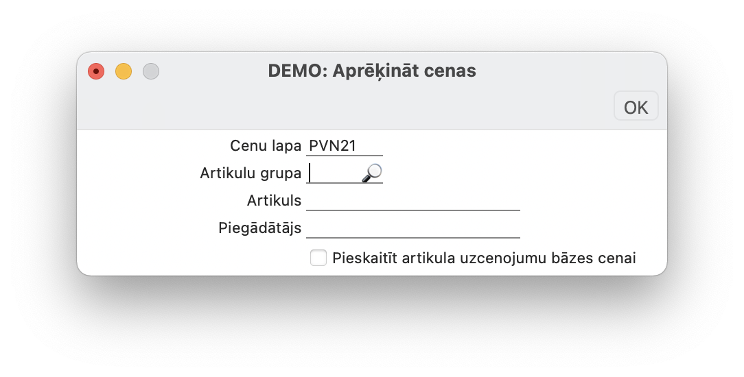 3. Modulī Pārdošanas vadība > Rutīnas > Apkalpošana > Pārrēķināt cenas, izvēloties nupat izveidoto Cenu lapu. Šai apkalpošanai vajadzētu reģistrā Cenas izveidot atbilstošus ierakstus ar cenām ar PVN.